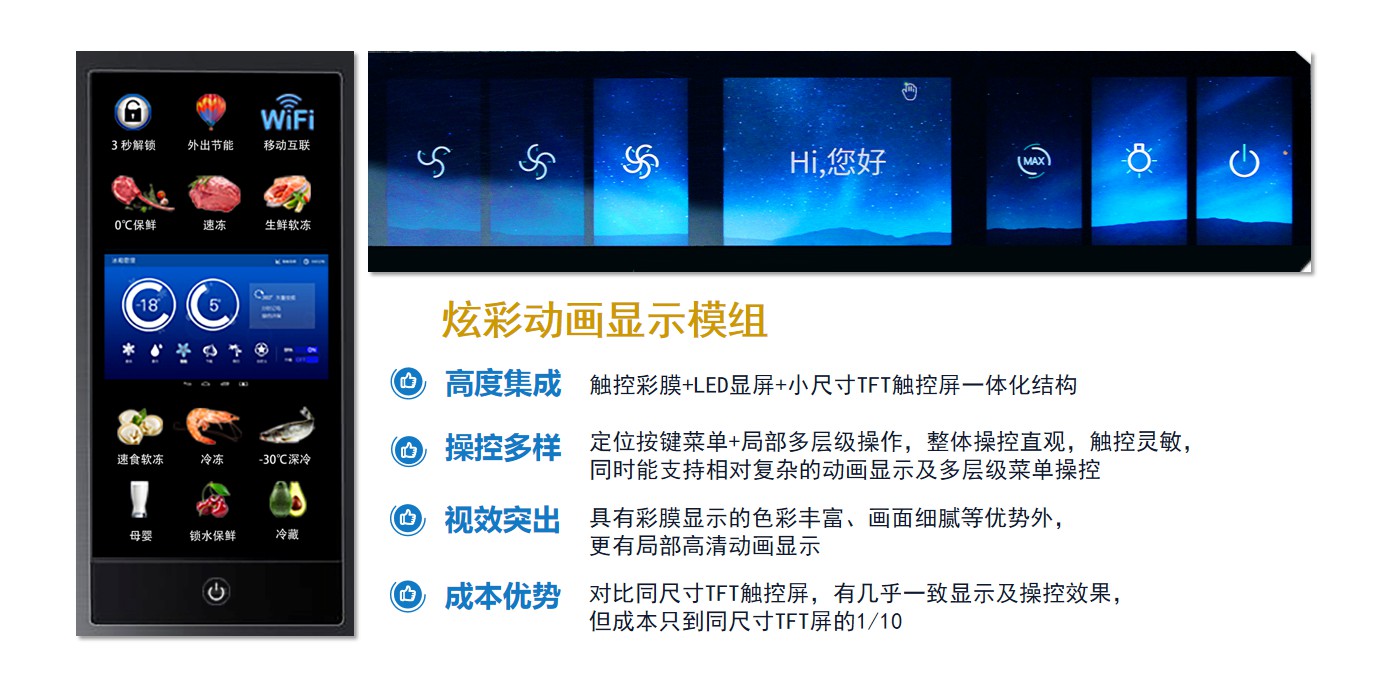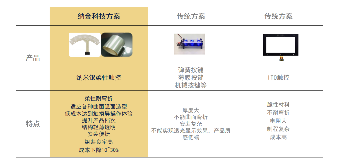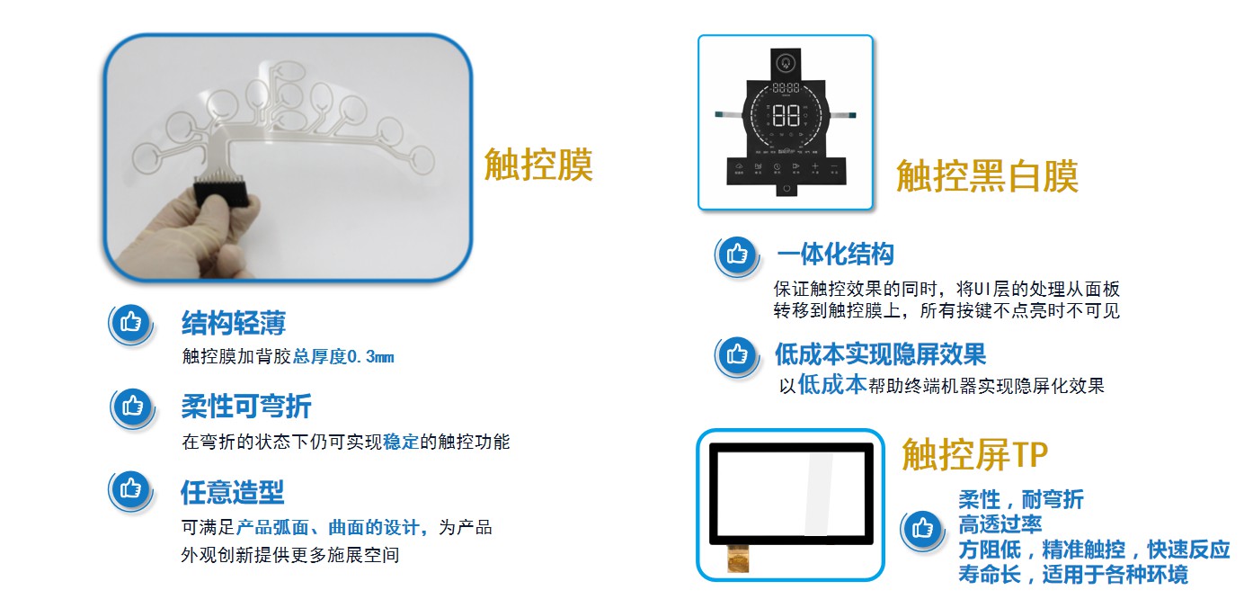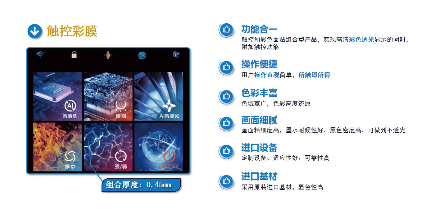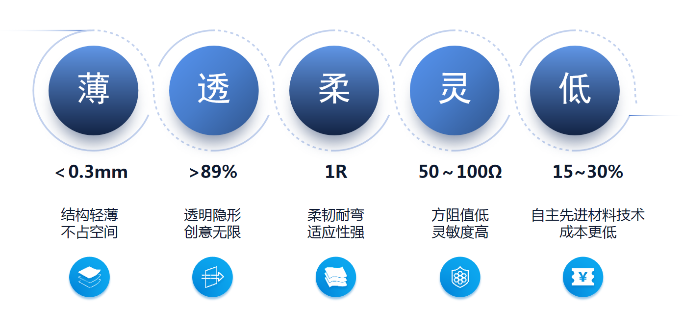 w88win中文手机版行业首创了基于纳米银材料的柔性薄膜触控和显示产品,纳米银触控膜结构轻薄,厚度仅0.3mm,透明度达到90%以上,柔韧耐弯折,可以做弯曲弧面曲面造型,方阻值低,灵敏度高,在此基础上结合高清彩膜开发出触控显示一体化模组,用原有弹簧按键的成本带来了比液晶屏加触摸屏更好的产品效果和用户体验,对比液晶触摸屏成本又能降低60%以上。
