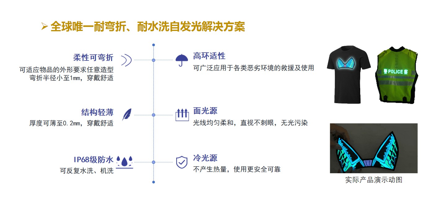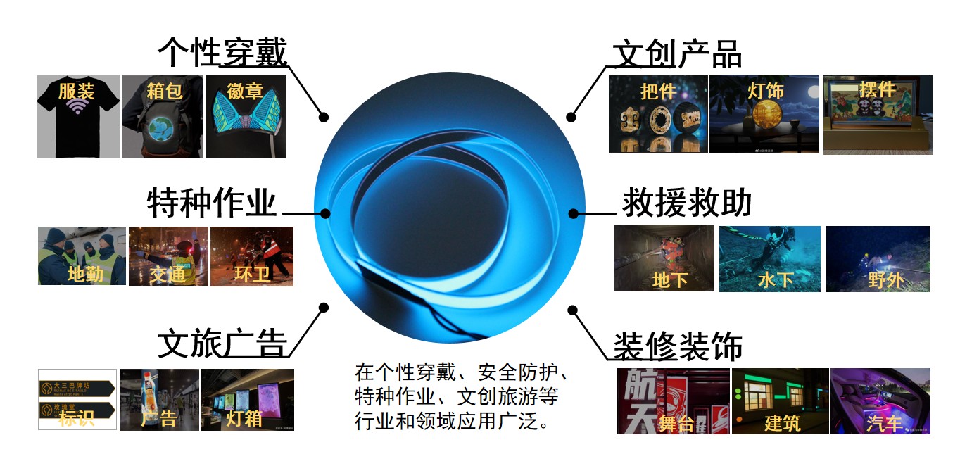 纳米银柔性薄膜发光片是一种把超细纳米银线材料与冷光源材料结合,将电能转为光能的装置。可适应物品的外形要求任意造型弯折半径小至1mm,穿戴舒适;广泛应用于各类恶劣环境的救援及使用。