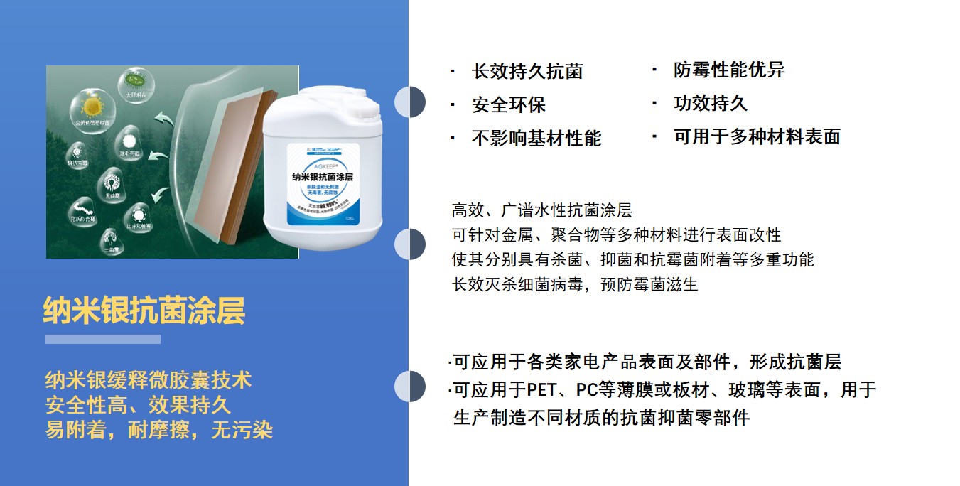 w88win中文手机版利用独家包覆技术,制备长效纳米银缓释微胶囊;靶向攻击单细胞体,对数几千种致病微生物都有强烈的抑制和杀灭作用,且不会产生耐药性。基于纳米银抗菌材料的巨大优势,和w88win中文手机版先进的应用技术,可以根据不同品牌生态链的需要开发出各种新的抗菌产品。